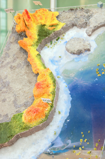 Toàn bộ hình ảnh đất nước Việt Nam được tái hiện sinh động trong mô hình “Sa bàn địa hình Việt Nam” do các bạn học sinh lớp 11 thực hiện. Từng ngọn núi hùng vĩ, những hòn đảo xa bờ đến vùng biển rộng lớn đều được mô phỏng tỉ mỉ, thể hiện đầy đủ đặc điểm địa lý của đất nước. Đặc biệt, với nền tảng kiến thức Địa lý vững chắc, mô hình càng trở nên ấn tượng nhờ sự phối màu tinh tế: từ gam màu đậm đến nhạt, thể hiện rõ ràng sự thay đổi độ cao của địa hình, từ đỉnh núi xuống vùng biển sâu, tạo nên một bức tranh chân thực và sống động.