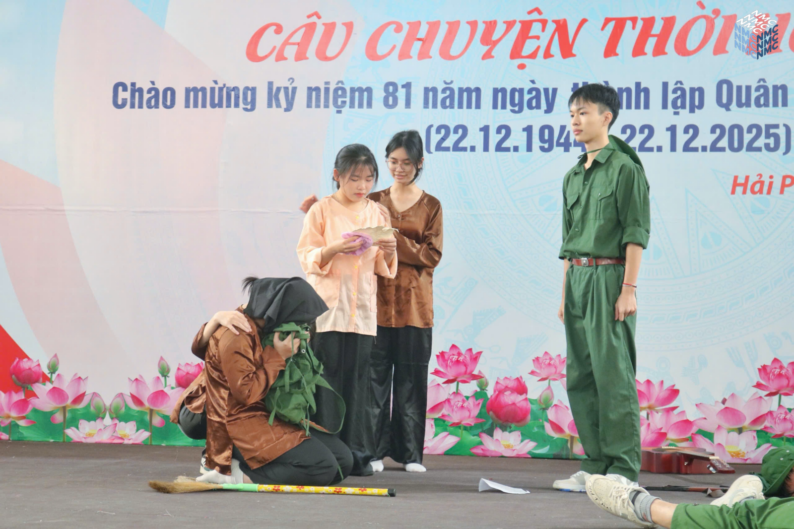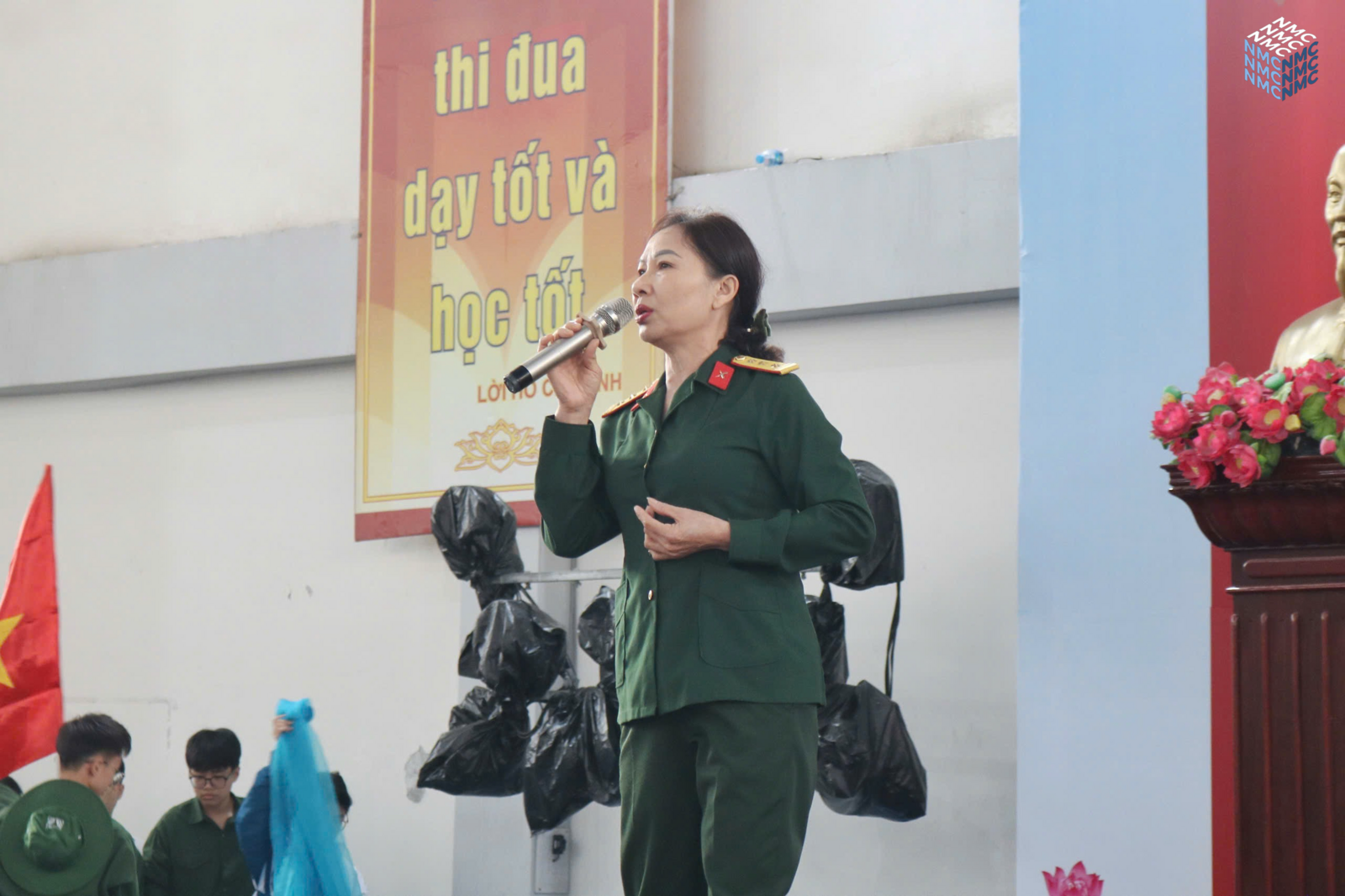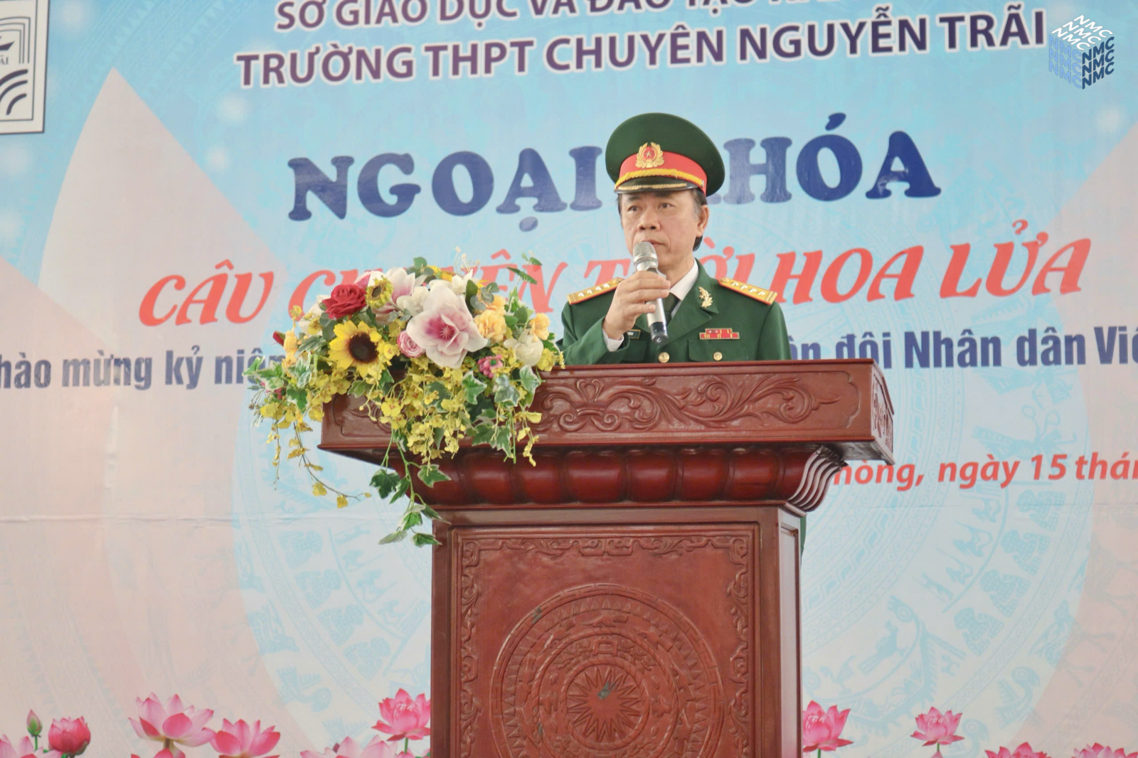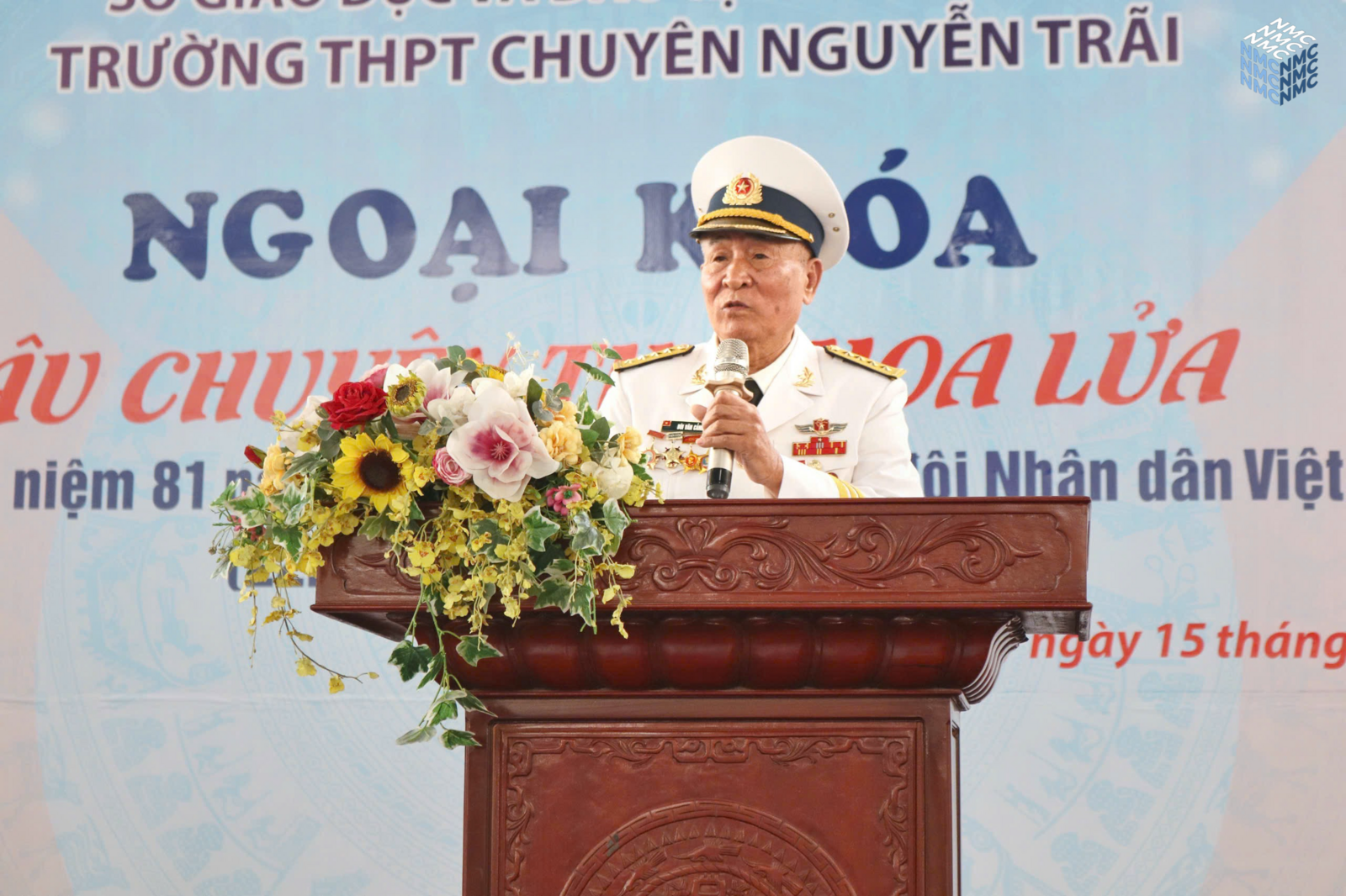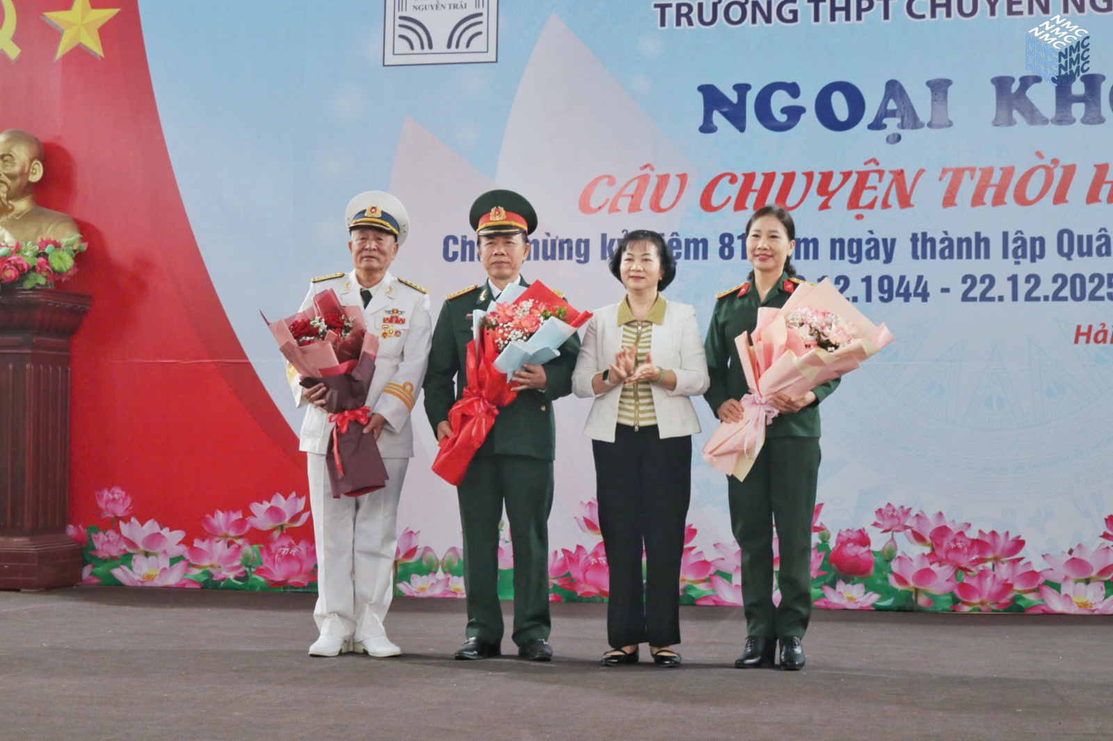 Sau vở kịch là phần được đón chờ nhất trong suốt buổi ngoại khóa đó là phần chia sẻ đến từ vị trí các cựu chiến binh. Trước tiên, Đại tá Lê Xuân Nhường, ông bước lên sân khấu và chào cả khán phòng theo đúng quy cách của 1 người lính để lại một hình ảnh vô cùng ấn tượng. Bác đứng trước toàn trường tuyên truyền về những dấu mốc quan trọng trong lịch sử của Quân đội nhân dân Việt Nam từ ngày đầu thành lập với chỉ 34 chiến sĩ “quần nâu áo vải” nay đã thành một quân đội hùng mạnh là niềm tự hào của dân tộc Việt Nam. Có lẽ đây sẽ là “tiết lịch sử” cảm động, chân thực, dễ hiểu, dễ tiếp thu hơn hẳn những giờ học trên lớp.